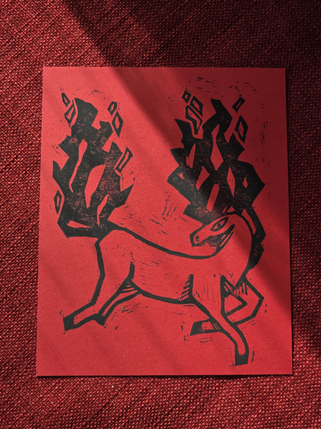 3. Une impression de linogravure (12 cm x 14.8 cm, papier cartonné rouge 180g)